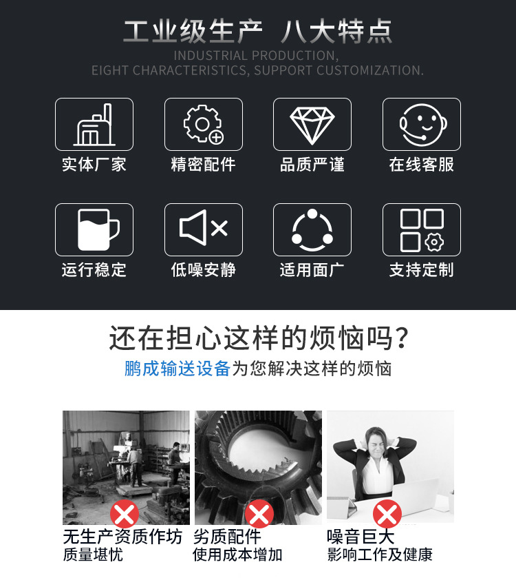 詳細信息 商品屬性 訂貨號PC6633 加工定制是 貨號PC 類型滾筒輸送機 品牌鵬成 型號600/800 輸送能力強(t/h) 功率90(KW) 輸送距離1000(m) 外形尺寸多種規格(m) 重量每單元約55(kg) 適用領域物流分揀貨物裝車神器 是否跨境出口專供貨源否