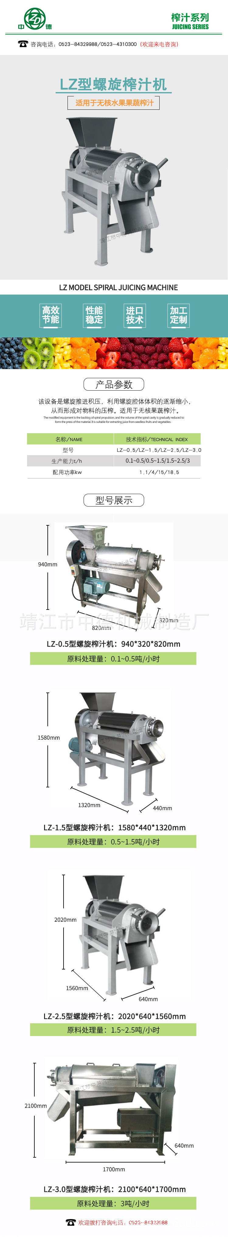 工作原理:破碎后的果肉、汁、皮通過進(jìn)料斗進(jìn)入雙螺旋榨汁機(jī),由于螺旋沿著料渣出口方向底徑逐漸加大而螺距逐漸減少,當(dāng)物料被螺旋推進(jìn)時,因螺旋腔體積縮小,形成對物料的壓榨。螺旋主軸的轉(zhuǎn)動方向從進(jìn)料斗向渣槽方向看去,為逆時針方向。原料加入進(jìn)料斗中,在螺旋的推進(jìn)下受壓,其壓榨的汁液通過過濾網(wǎng)流入底部的盛汁器,而廢料則通過螺旋及調(diào)壓的錐形部分之間形成的環(huán)狀空隙排出,調(diào)壓頭沿軸向的移動并直接受液壓系統(tǒng)控制。調(diào)節(jié)液壓系統(tǒng)的壓力,即調(diào)整排渣的阻力,即可改變出汁率,但如果液壓系統(tǒng)壓力過大,在強(qiáng)力擠壓下,部分渣的顆粒會和汁一起通過過濾網(wǎng)被擠出,盡管出汁增加,但汁的質(zhì)量相對下降,液壓系統(tǒng)壓力的大小應(yīng)視用戶具體工藝要求而定。從而達(dá)到汁與渣自動分離的目的。
