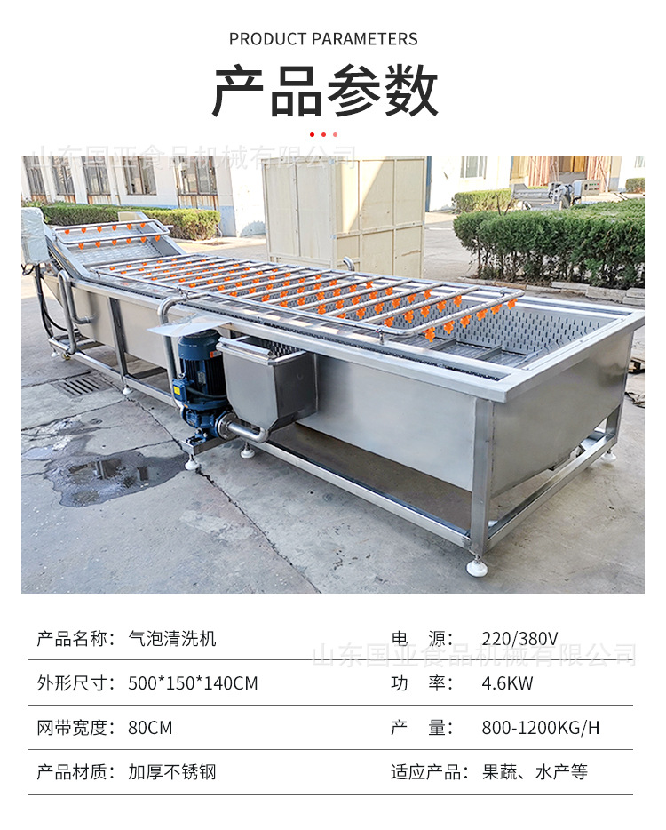 產品采用不銹鋼制造而成、堅固耐用、設備原料不會受損傷,從而達到洗潔凈高、節省勞力、節水、設備 性穩定,可靠等效果,裕豐牌氣泡清洗機、集自動連續清洗。被清洗物潔凈高出人工常規洗法三倍以上。 本機采用高壓水流和氣泡發生裝置沖擊被清洗物體表面,氣泡在與物體接觸時破裂產生的能量,會對被清洗物體表面起到一個沖擊和刷洗的作用,刷洗被清洗物體表面,將被清洗物體清洗干凈。